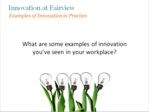 Participants will gain an understanding of innovation. They will learn how to recognize and reinforce factors that foster a culture of innovation and articulate the importance of driving innovation at Fairview. Participants will understand key principals of innovation and apply them to produce innovative solutions at work. They will leverage tools and strategies to help identify opportunities for innovation and then implement those strategies to drive innovation within their department.